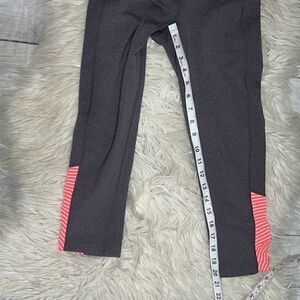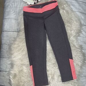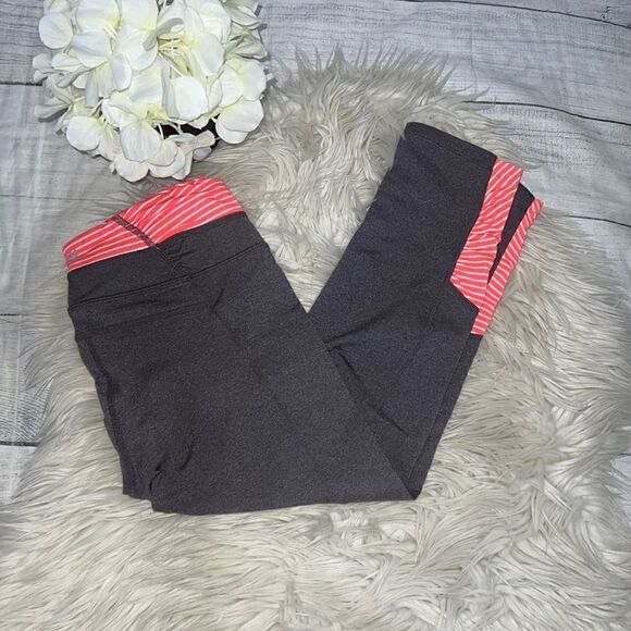 Good, preloved condition. Athleta Balance Stripe Capri Cropped Leggings. Gray Orange shades.