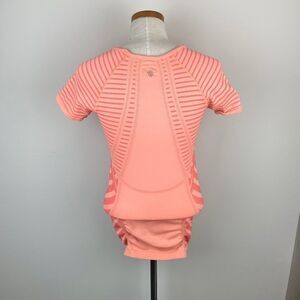 This short sleeve workout top is in excellent condition. Featured with orange stripes throughout and a ruched style down the sides. Coral in color. No size tag - please reference measurements. Please send any offers or questions!