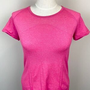 This workout tee is in excellent condition. Featured with a ruched fabric and is extremely comfortable. Pink in color and size small. Material made from polyester, cotton, and spandex. Please send any offers or questions!