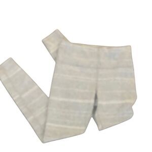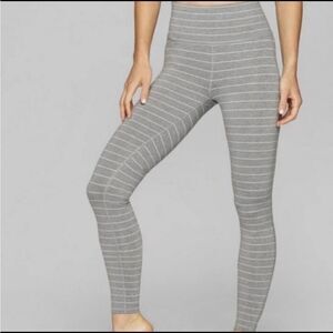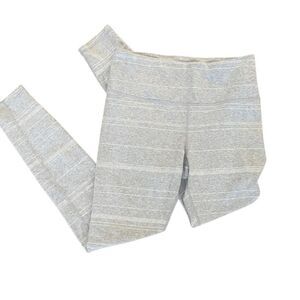 Gray and white striped tight leggings for casual play or serious workout featuring a 3.5” comfort waistband, hidden key envelope pocket and a 7/8 length.