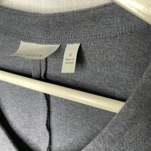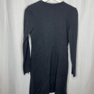 Athleta blue/gray Celebration dress in size medium. Stretchy fitted dress, zipper detail on pockets and sleeves. V Neck style. Long sleeves. Cotton 40%, modal 29%, nylon 27%, spandex 4%, machine wash.