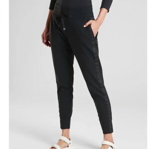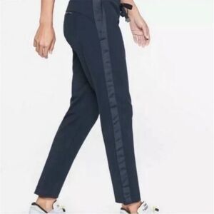 Nylon/spandex blend, ankle jogger, fitted with mid rise waist, ankle pants, ribbon tuxedo strip on the side, front zip pockets and slide pockets. Back zip and signature logo
