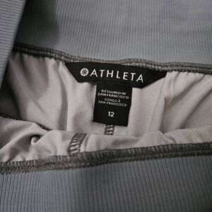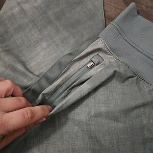 This is a pair of the Nolita slim crop pants by Athleta. They are green and have an elastic waistband and pockets on each side. These pants also have a green stripe down the sides.