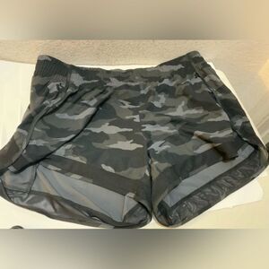 Athleta Printed Mesh Racer Run Lined 4” Black Camo Shorts L EUC