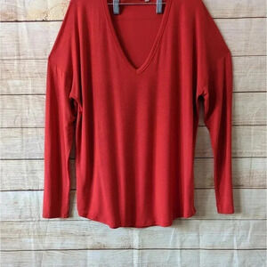 Athleta Size XL Cloudlight V Neck Tee Red Drop Shoulder Curved Hem Stretchy