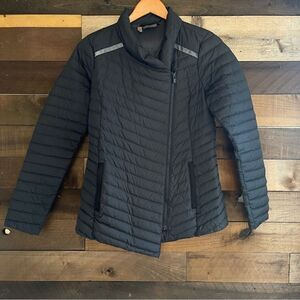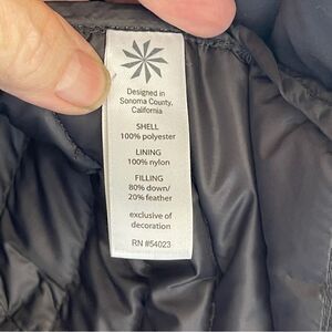 Athleta So Down Jacket Excellent Condition Size XS (0/2) B 32/33 W 25/26 and H 34.5/35.5 Semifitted Interior adjustable waist cord Reflective trim on shoulders and back Two front zipper pockets Goose down and lightweight Machine wash and air dry