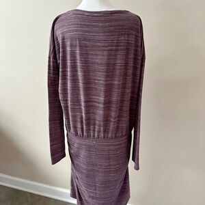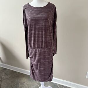 Step out in style in this plum and grey striped, long sleeve dress by Athleta. Featuring flattering ruching along the sides and a scooped neckline. Polyester, rayon and spandex blend. Length 37” x Width 22” pit to pit.