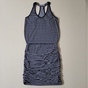 Keep things comfortable and breezy in this cute and short midi dress from Athleta. Lightweight, of a super-soft fabric, the stripe racerback tee dress is one you’ll live in-it's designed to keep you cool, even on the hottest days! A relaxed fit with room to move, this dress has a scoop-neckline, built-in shelf bra, a racerback and a lined skirt with ruching on both sides. Dress is in perfect condition.