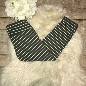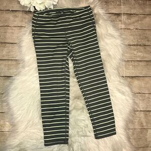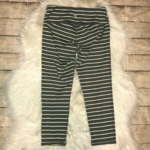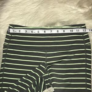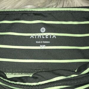 Great, preloved condition. Athleta Striped Chaturanga Leggings. Capri, cropped length. Gray and light green stripes. Hidden pocket in the waistband. Athleisure. Slight signs of normal wear. No pilling. Body: 88% polyester, 12% Lycra spandex.