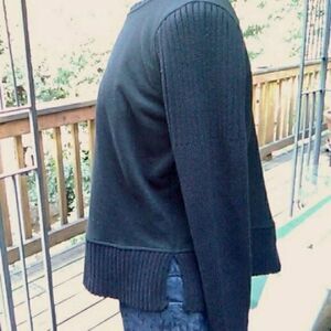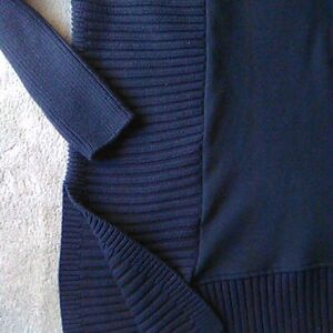 Body is a smooth sweatshirt fabric like a French terry; sleeves, bottom, neck are ribbed cotton. Size says XXS is showing larger than my size 6 mannequin. Slightly asymmetrical shape. 48 at chest, 48 at bottom hem, 24 -27 long from shoulder to hem. Sleeves 25 long. This would be great all year, and is so cute on