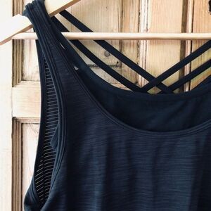 Features: Very cute strappy back tank top with built in bra. Tank layered over the sports bra. The bottom of the back is slightly slit open and can be worn open or tied.