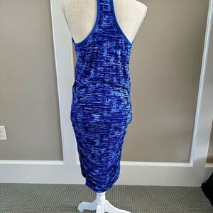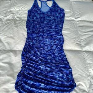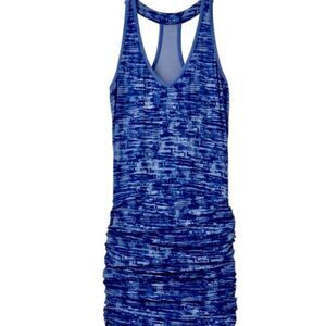 Boasting a sleek racerback silhouette, this multi-blue print sporty dress gives a full range of movement and style. Featuring a v-neck, ruched sides in a spandex blend. Length 41” x Width 16 1/2” pit to pit. Like new.