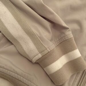 Tan color. No flaws. Worn once. Great jacket to have for all seasons. Super comfortable in a neutral color.
