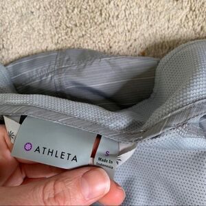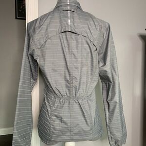 Excellent condition lightweight jacket by athleta. Grey with white stripes and reflective details make this the perfect jacket for your night run! Lying flat armpit to armpit approx 20” and top of shoulder to bottom hem approx 24”