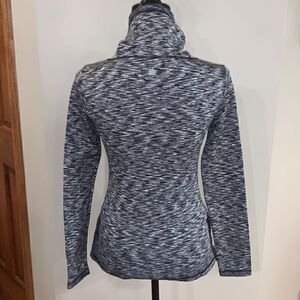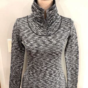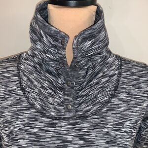 Very good used condition, smoke free. Size XXS, measures 15 3/4 inches pit to pit. Very warm, high neck with snaps that can also be folded down. Snaps on the bottom of both of the sides that can be worn closed or open. Black white and gray print
