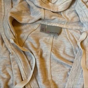 Athleta Inner Twist pullover size XXS. Color is oatmeal heather. In excellent preloved condition. Flowing French terry boasts a beautiful drape that stretches with your every move. Skims over the body, banded hem hugs your hips. Thumbholes. Measurements lying flat Pit to pit 16" Length 24.5" Smoke free home. Check out my other listings. Bundle and save!