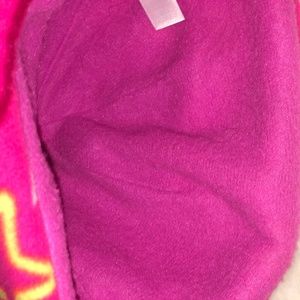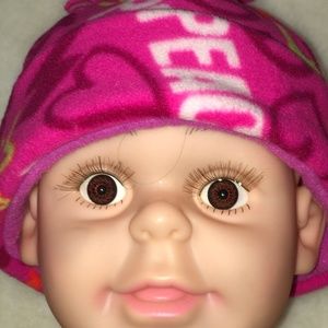 She's the cutest kid on the block when she's wearing this girl's pretty in pink peace beanie Soft, and warm, fleece-lined beanie.