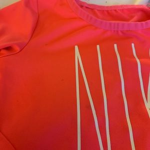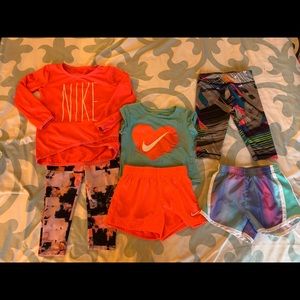Bundle of athletic apparel, size 2t. All Nike except grey crop pants which are adidas. Small stains on long sleeve Nike shirt (see photo for zoomed in appearance)