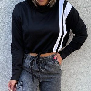 Cozy and Chic is what you need right now and this athletic cropped hoodie pullover that is oh, so chic will do the trick. Black with white color-blocking for an edgy vibe. Pair with your favorite leggings or denim shorts for the perfect athleisure look.