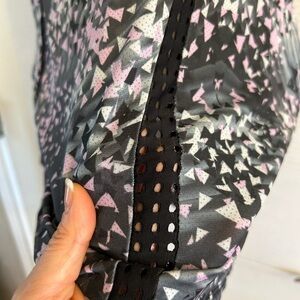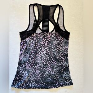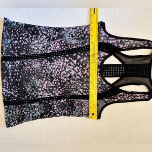 Athletic sleeveless tank top with ventilated holes. 96% polyester & 4% spandex. Color: pink, black, & gray design. Pre owned in great condition.
