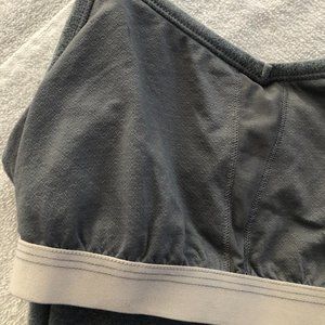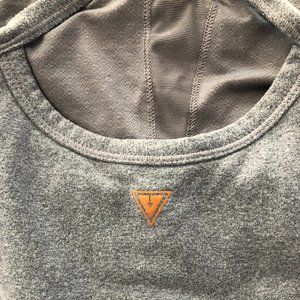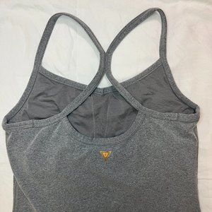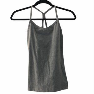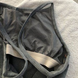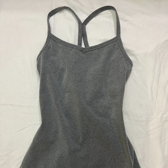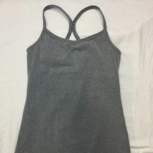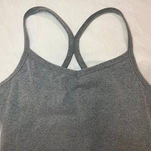 Grey, racerback tank with built in bra. There is no padding included but built in bra has openings to have padding put in! It's only been worn a handful of times so it's still in great condition. Straps are not adjustable. It's very stretchy material and great air wicking.