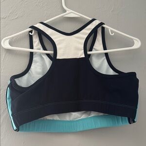 Stylish crop top with a sporty design. Features a blue front with white accents. Perfect for workouts or casual wear.