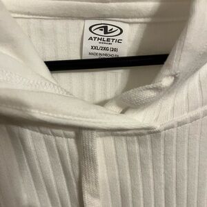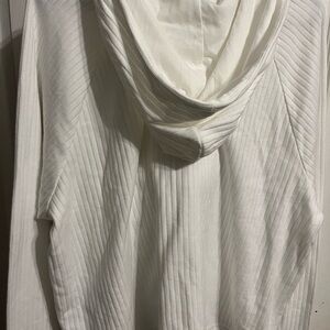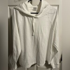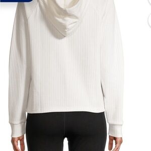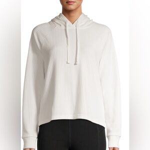 Stylish ribbed hoodie with drawstring detail. Features a cropped length and long sleeves. Ribbed texture throughout adds visual interest. Perfect for layering or casual wear.