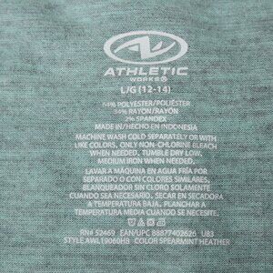 This Athletic Works women's top is perfect for travel and casual wear. The scoop-neck and ruched sides add a touch of style to this basic T-shirt, which comes in a spearmint heather color. It is made from a comfortable and breathable polyester blend fabric that is easy to care for and tagless. The sleeveless design makes it suitable for summer, fall, and spring seasons. The shirt is machine washable and available in size L. It has a regular fit and measures 21 inches pit to pit and 27 inches from top of back to bottom. This T-shirt is a great addition to your wardrobe and can be worn on any occasion.