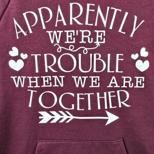 When lounging around or engaging in light outdoor activities, this hoodie from Athletic Works serves as an essential wardrobe piece. The playful design reading "Apparently We're Trouble When We Are Together" adds a touch of humor, while the kangaroo pocket provides a practical space for small essentials. Crafted with recycled polyester and modal, it ensures comfort and style.