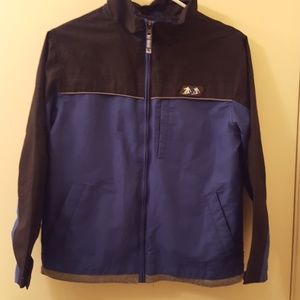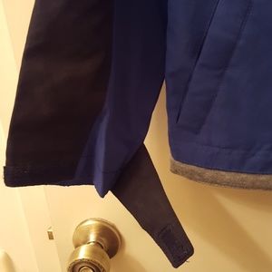 Blue and black lined jacket. Excellent used condition. Three velcro closure front pockets and adjustable velcro wrist closure.