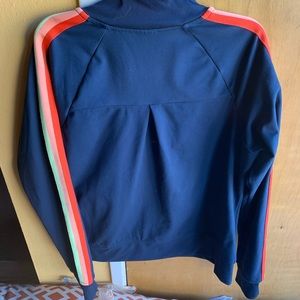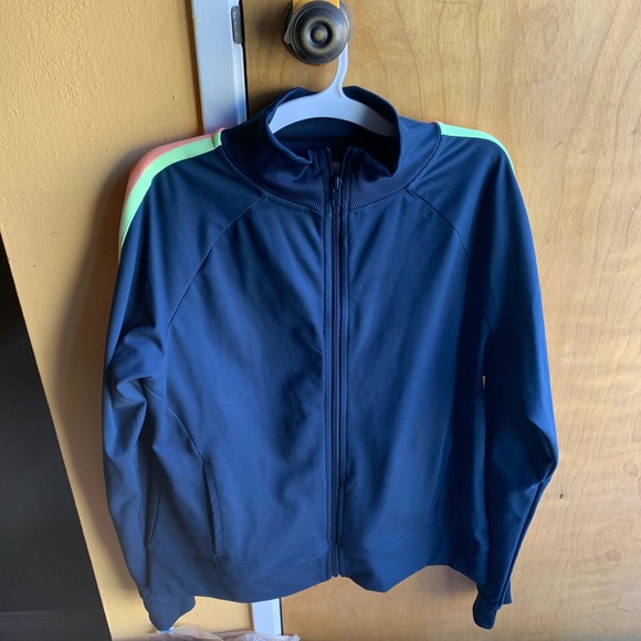 Size L jacket. Navy blue with colored stripes on sleeves. Polyester and spandex. Never worn. Fall, winter, spring. Windbreaker. 💙