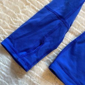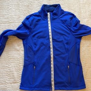 Very cute athletic jacket. It has thumb holes to keep your hands warm and Zippered pockets. The material is thick and keeps you warm while you run. It’s fitted and has a flattering cut.