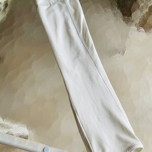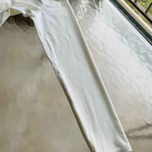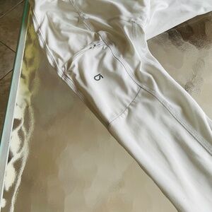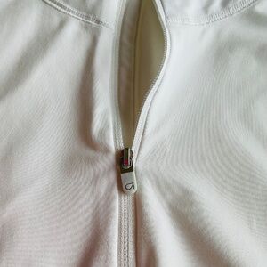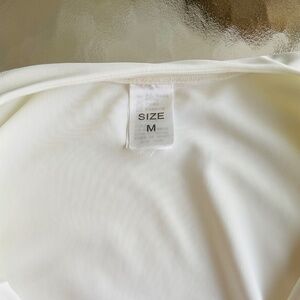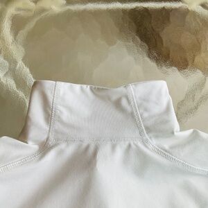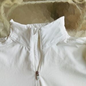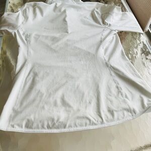 SBART Brand long sleeved athletic/yoga top, White color, has top front zipper, side pull strings, dimensions: bust pit to pit 18 inches, hips 16 inches, very stretchy and comfortable, like new