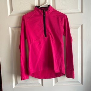 Pullover zip up, hot pink fleece lined athletic jacket. Used in good condition