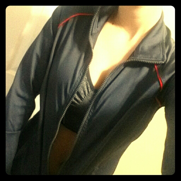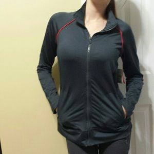 Dark grey with red detailing. Brand new WITH TAGS, never worn besides for listing pictures. Small, semi-fitted. Silky smooth material, perfect condition! Designed for working out but still super cute!