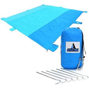 Large blue beach blanket by Athletrek. Includes stakes and carry bag. SAND FREE & QUICK DRYING - Looking for a sand free beach experience? The Athletrek Beach Blanket was designed with just that in mind. This soft and skin friendly fabric ensures that sand can easily be brushed off the blanket, and water will quickly dry within minutes, unlike a regular beach towel.
