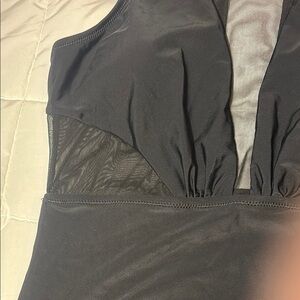 • This classic black one piece bathing suit features mesh detail. The removable padding push-up bra and neck hook closure provide support and shaping.