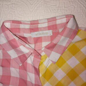 Atikshop Button-Up Shirt Pink & Yellow Gingham Colorblock Front Pocket Womens