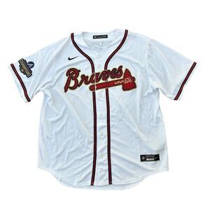 Show your support for the Atlanta Braves with this Nike Jersey in a crisp white color. Perfect for game days, casual outings, or any occasion where you want to showcase your team pride, this jersey is designed for comfort and style. The breathable fabric ensures you stay cool, whether you're cheering from the stands or enjoying a backyard BBQ. With its Major League Baseball authenticity, this jersey is a must-have for any Braves fan. Available in size XL, it's new with tags, ready to be part of your collection.
