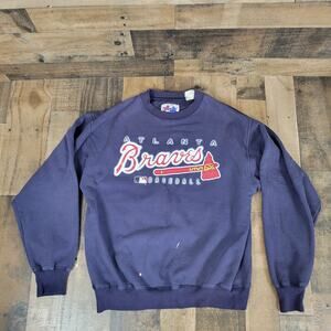 Atlanta Braves Baseball Crewneck Sweater MLB Vintage 90s Majestic Navy Blue Red Mens Large. Size tag is faded. Measurements are in the photos. Good pre-owned condition, minor bleach stains on front (see all pictures), smoke free home, ships quickly!