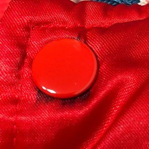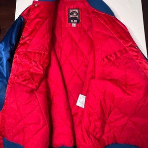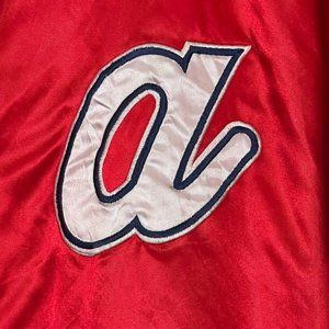 Cooperstown Collection G-III & Carl Banks. Quilted Atlanta Braves red satin jacket with blue sleeves. Embroidered left chest lower case "a" and Braves spellout across back. Embroidery is in good condition. Snap closure. Jacket has small spots/areas of discoloration. Photos 9-14.