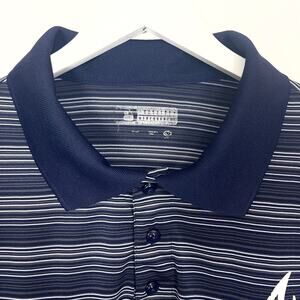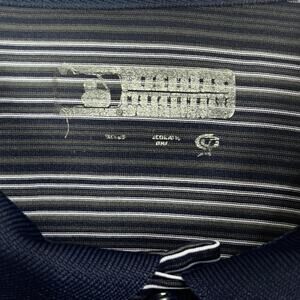 Navy blue striped polo in performance fabric. Logos on chest and sleeve.
