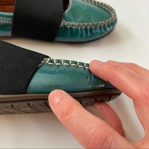 Atlanta Mocassins Kids Teal Patent Leather Slip-On Loafers with Elastic Strap. Unique, high end children’s shoes handmade in Portugal. Uppers and inner soles made from genuine leather. Kids size 28 equates to US kids size 11. There are a few spots and scuffs. Please refer to the pictures. IMO these flaws are outweighed by the high quality and uniqueness of the shoes.