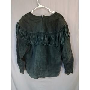 Atlantic Beach leather and coat works. Dark blue leather shirt with zipper (5.5") in back, two inch side slit, five inch fringe, blue beading and metal and bead concho. Lined and in very good condition.