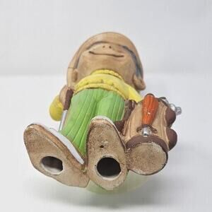 Vintage ceramic figurine depicts a cheerful golfer caddy in a green and yellow outfit with a big smile on his face.