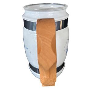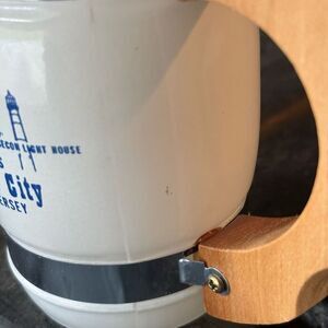 Atlantic City New Jersey Vintage Souvenir Siesta Ware Mug. 5” tall white glass mug with wooden handle. Dave is etched on top metal band on front. Has a small imperfection by the handle. No chips or cracks.