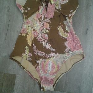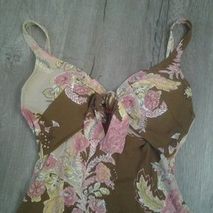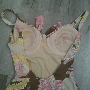 Colors are pink, chocolate brown, tan, yellow and gray. Underwire, double padded cups. No stains or pilling. One piece swimsuit, with hidden underwiring for reassuring cover and enhanced support.