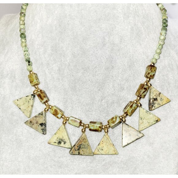 A striking 16-inch necklace featuring earthy Atlantisite and Malachite gemstones, accented with triangular pendants and secure lobster claw closure. A timeless piece of elegance.