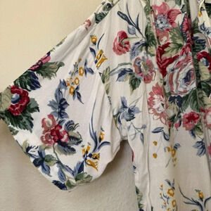 This Atlast Studio blouse is a white floral shirt with a collared neckline and short sleeves. It features a relaxed fit and a button front closure. Made of chiffon rayon, it is a casual piece perfect for a bohemian or garden-themed outfit. The blouse is vintage and is ideal for wearing in the fall, spring, or summer seasons. Size Small.