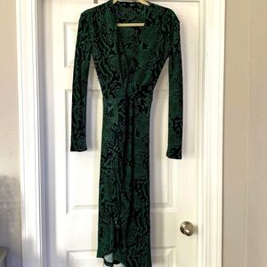 Green snake printed jersey (100% Viscose). Sheath. Long sleeves. V-neckline. 43" from shoulder to hemline. Imported.